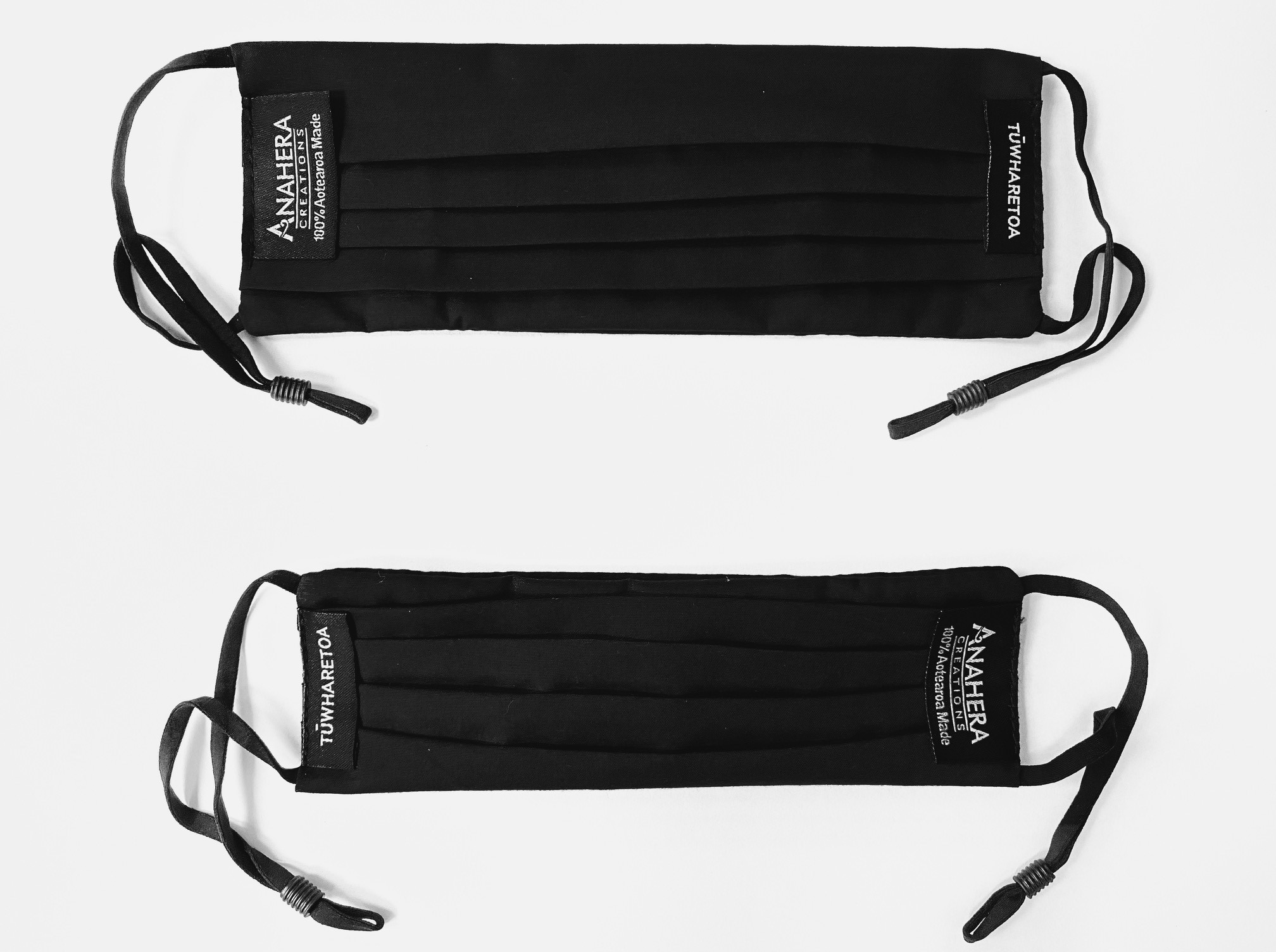 ✓ 4-pleat design ✓ Poly-cotton ✓ Double layer ✓ Pocket for extra filter ✓ Adjustable ear loops ✓ Pliable nose piece ✓ Two sizes (adult & tamariki)